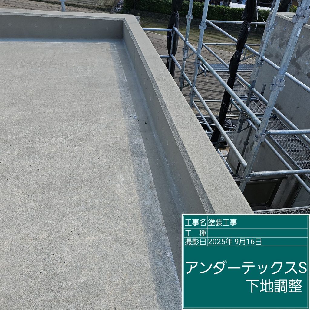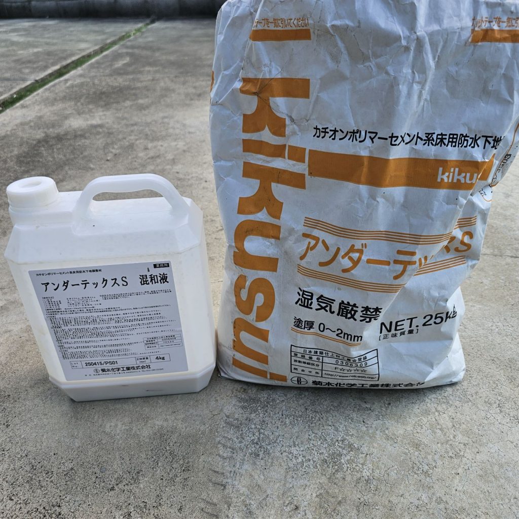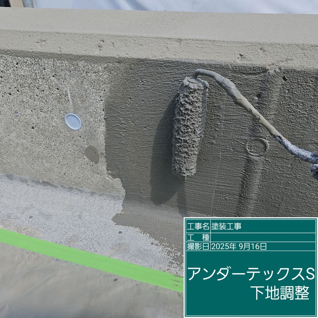まずは経年劣化した下地を「下地調整」としてカチオン系ポリマーセメント材を塗布し、表面を平滑に整えます。材料は壁面で使用した材料とは異なる防水工事用の下地調整材を使用します。