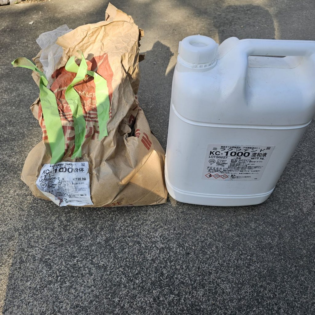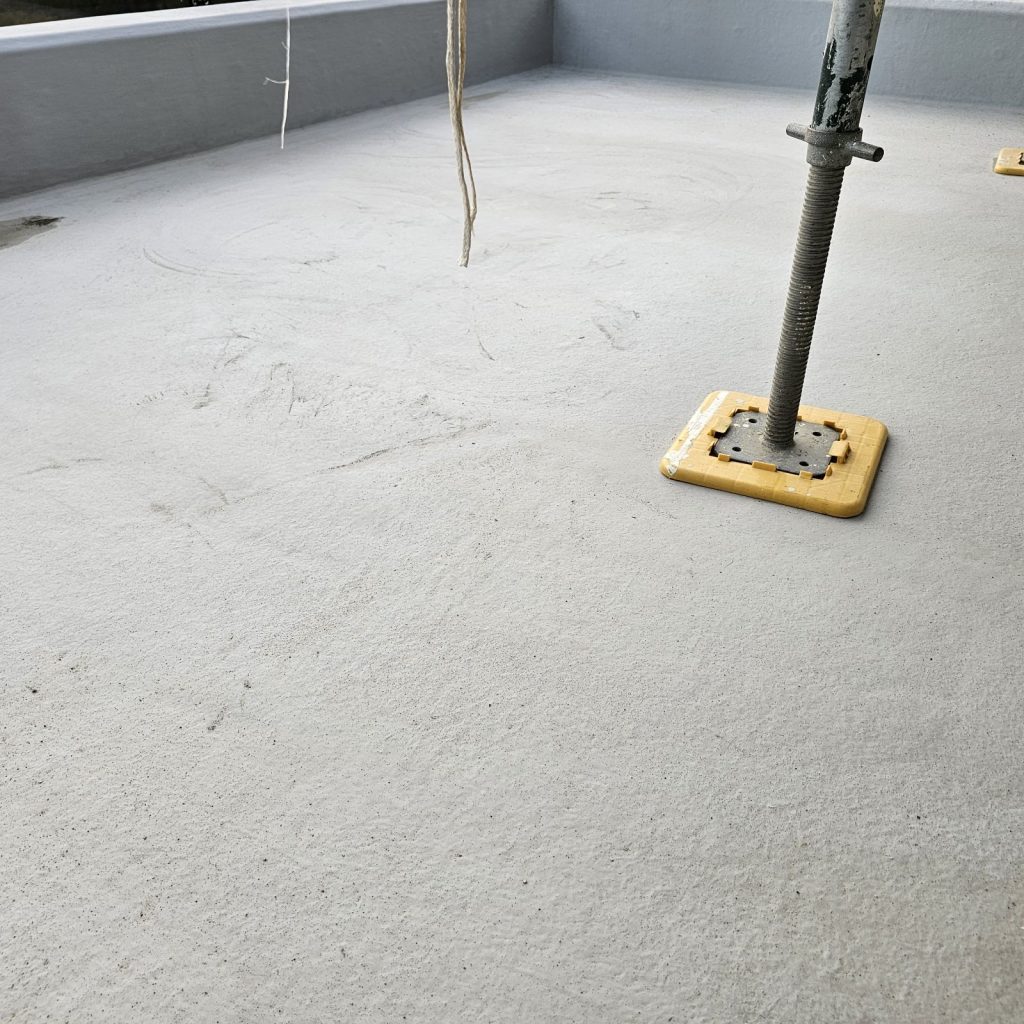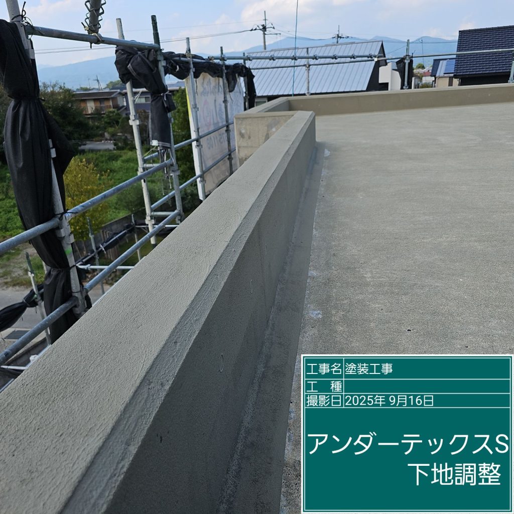まずは経年劣化した下地を「下地調整」としてカチオン系ポリマーセメント材を塗布し、表面を平滑に整えます。材料は壁面で使用した材料とは異なる防水工事用の下地調整材を使用します。