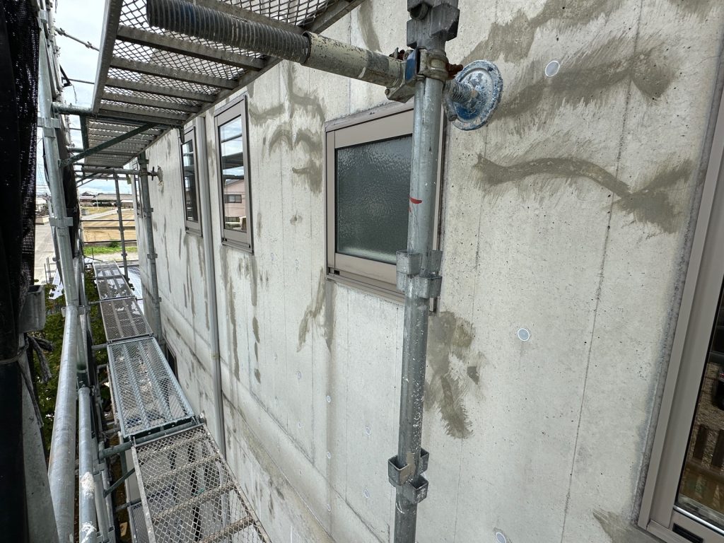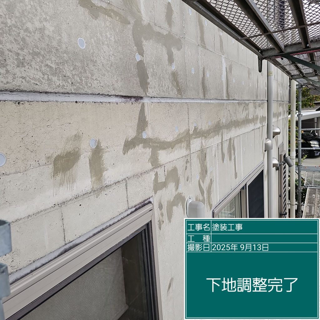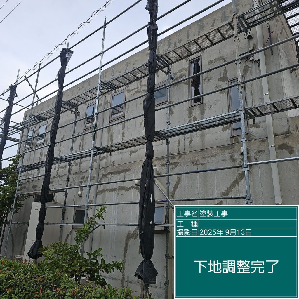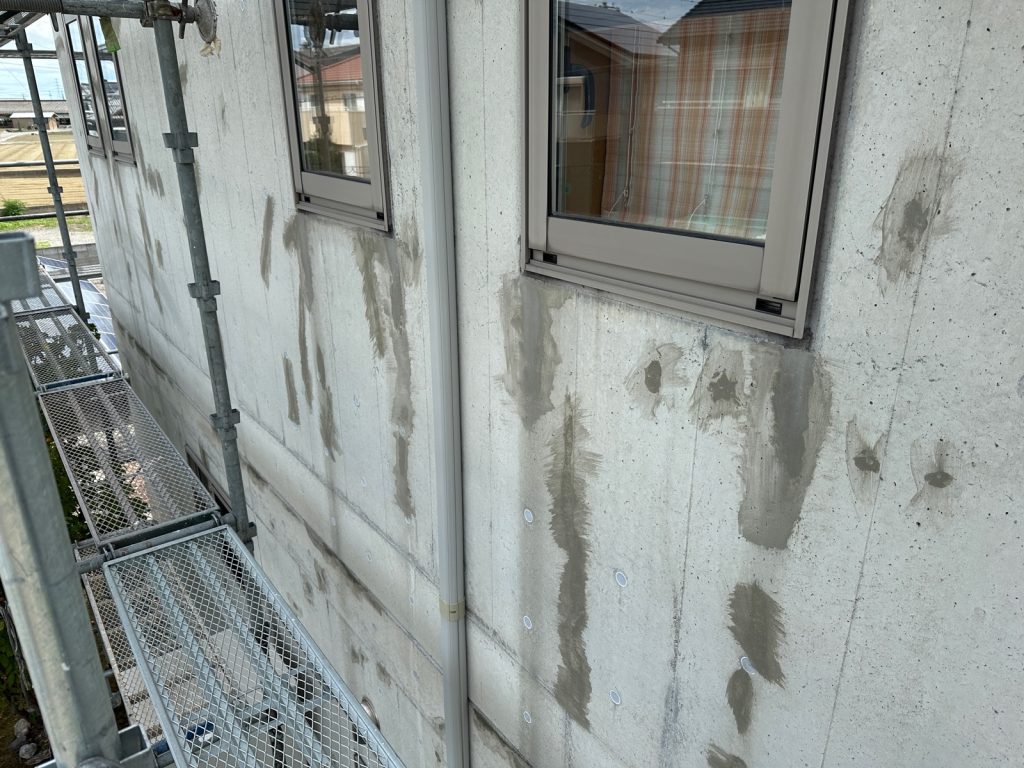 足場を組立して念入りに確認していくと結構な量で気になる箇所が出てきました💦現場を担当する職人も私も“とことん納得いくまでやる”という所が特技みたいなものですから、時間を忘れてひたすらに下地調整を行いました(^^;)