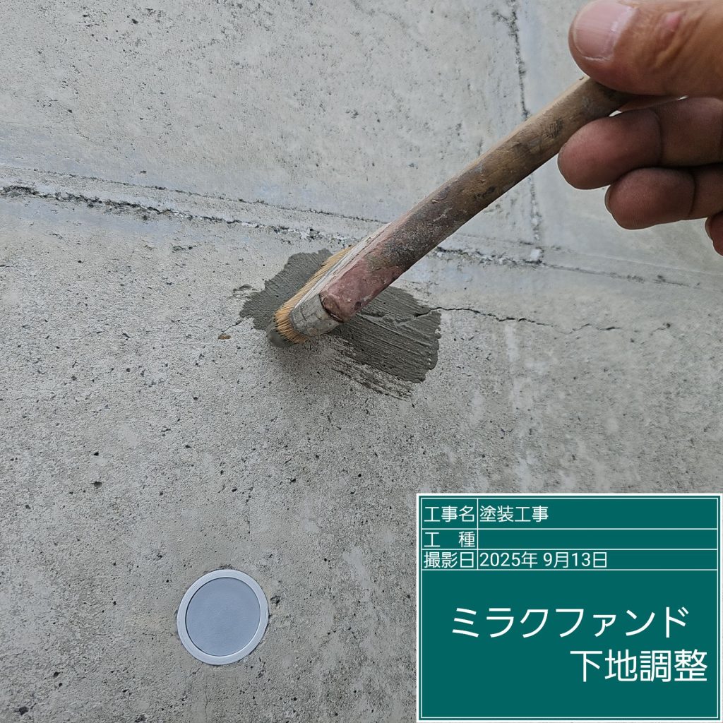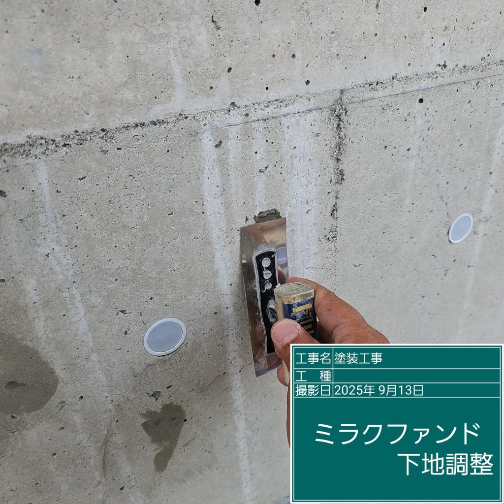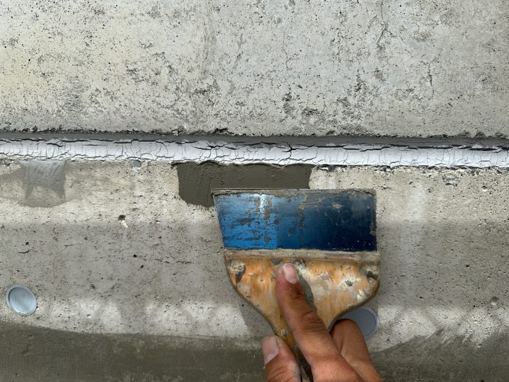 コンクリート壁面には、「ジャンカ」や「巣穴」と呼ばれるコンクリート打設時に発生する施工不良が多くの場合ありますので、下地調整材で事前に補修を行う必要があります👆