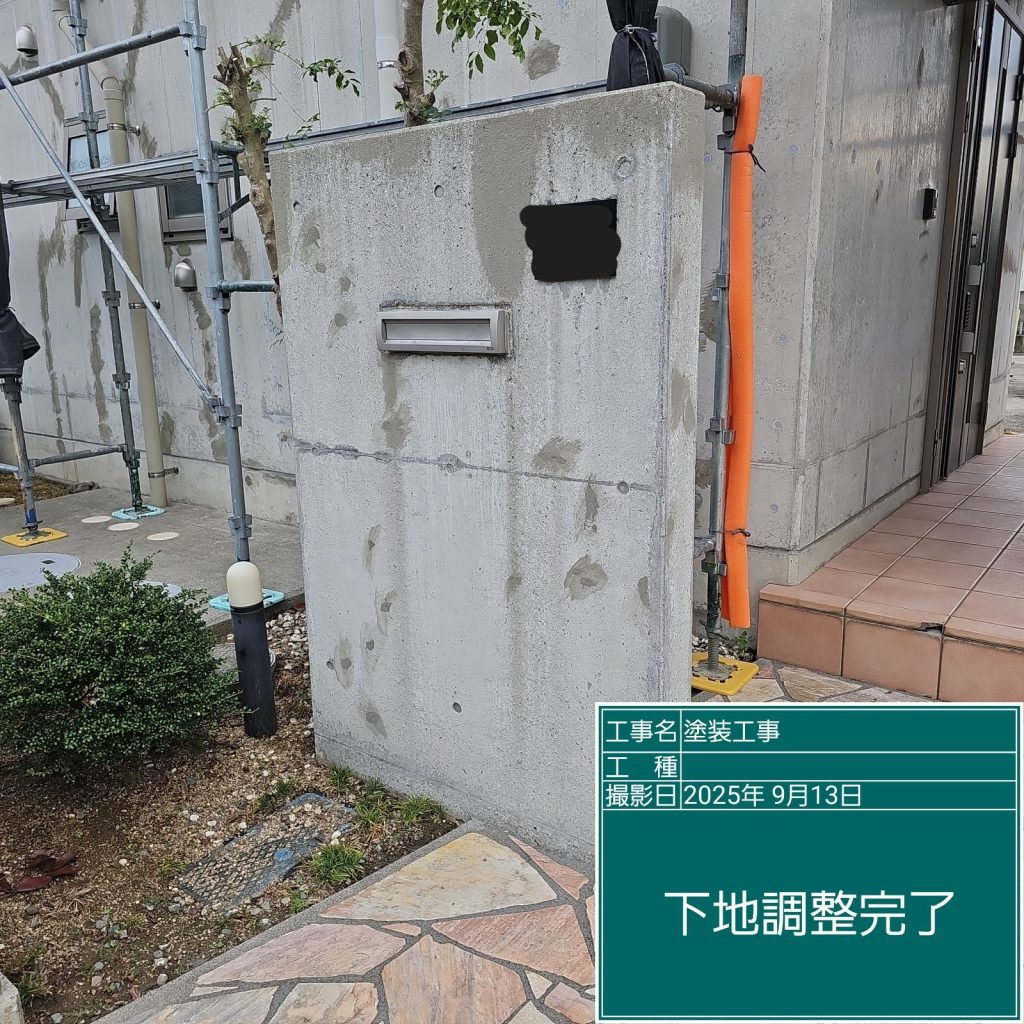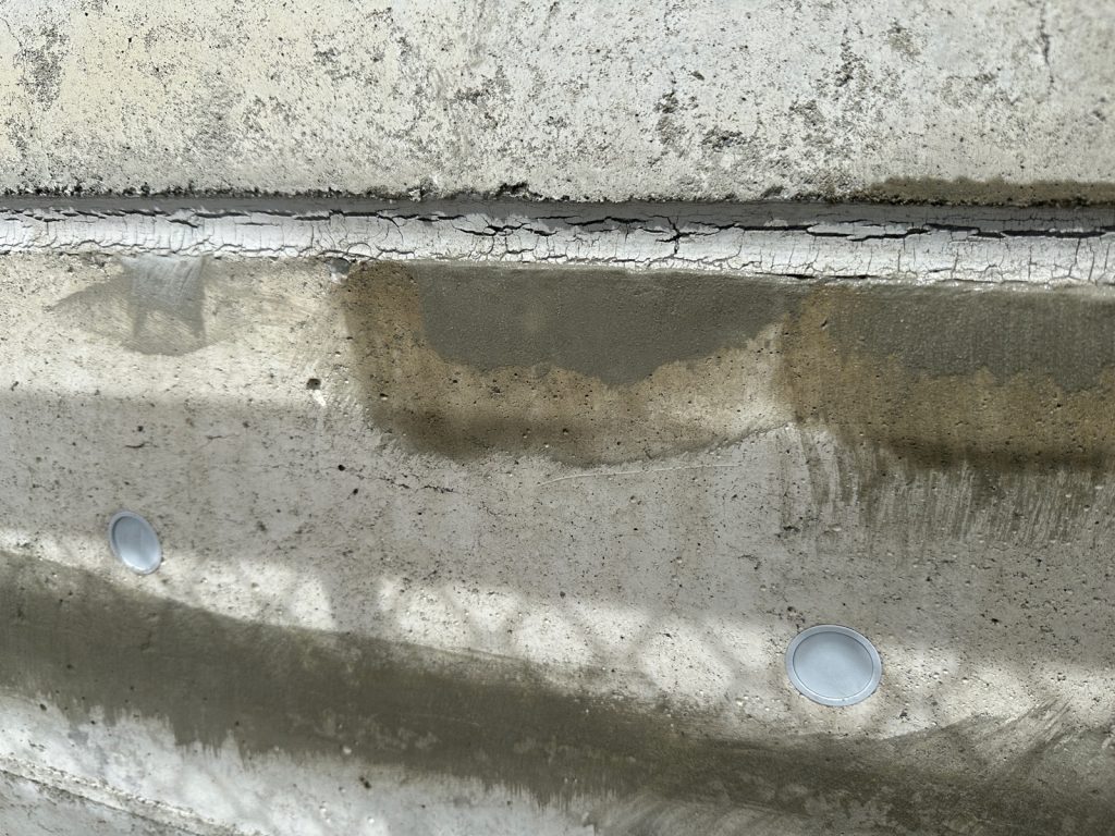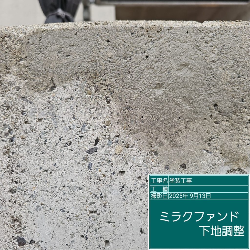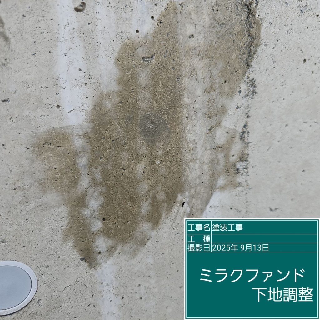 コンクリート壁面には、「ジャンカ」や「巣穴」と呼ばれるコンクリート打設時に発生する施工不良が多くの場合ありますので、下地調整材で事前に補修を行う必要があります👆