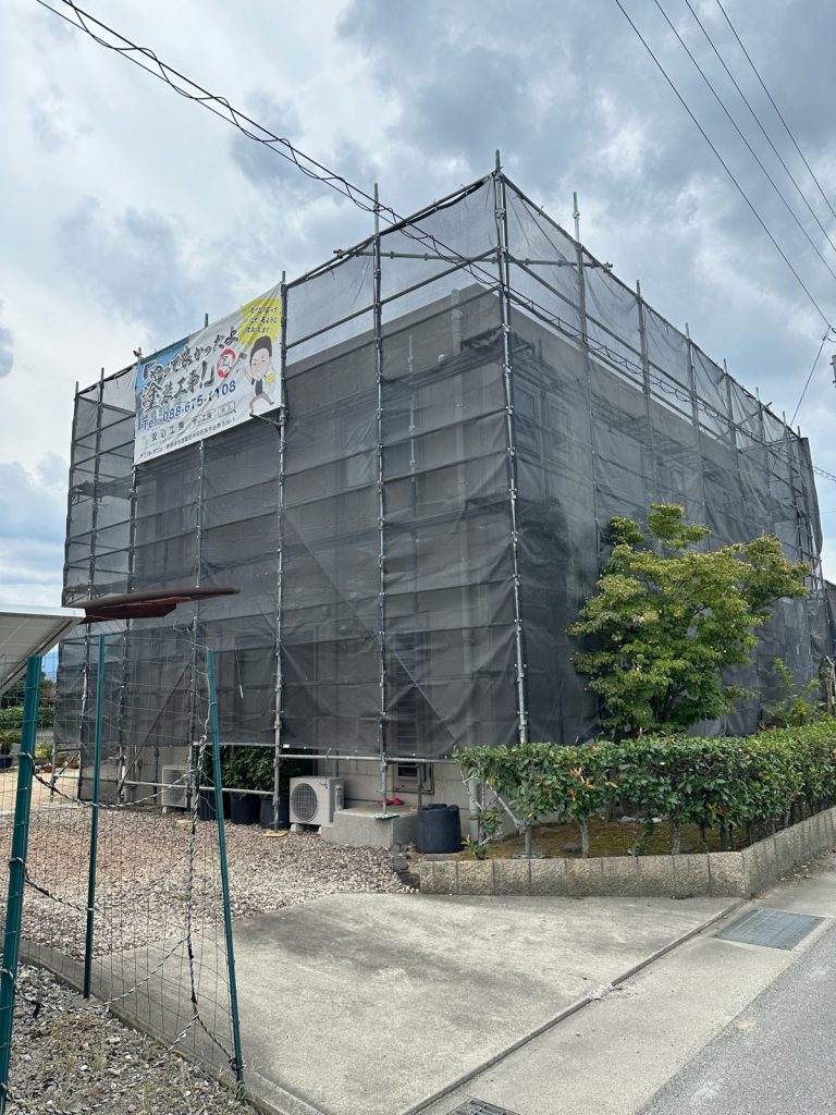 名西郡石井町藍畑K様邸の屋根・外壁塗装工事が始まりました。しばらくの間、近隣の皆様方には大変ご迷惑をお掛けしますが、ご理解・ご協力をお願い申し上げますm(__)m
