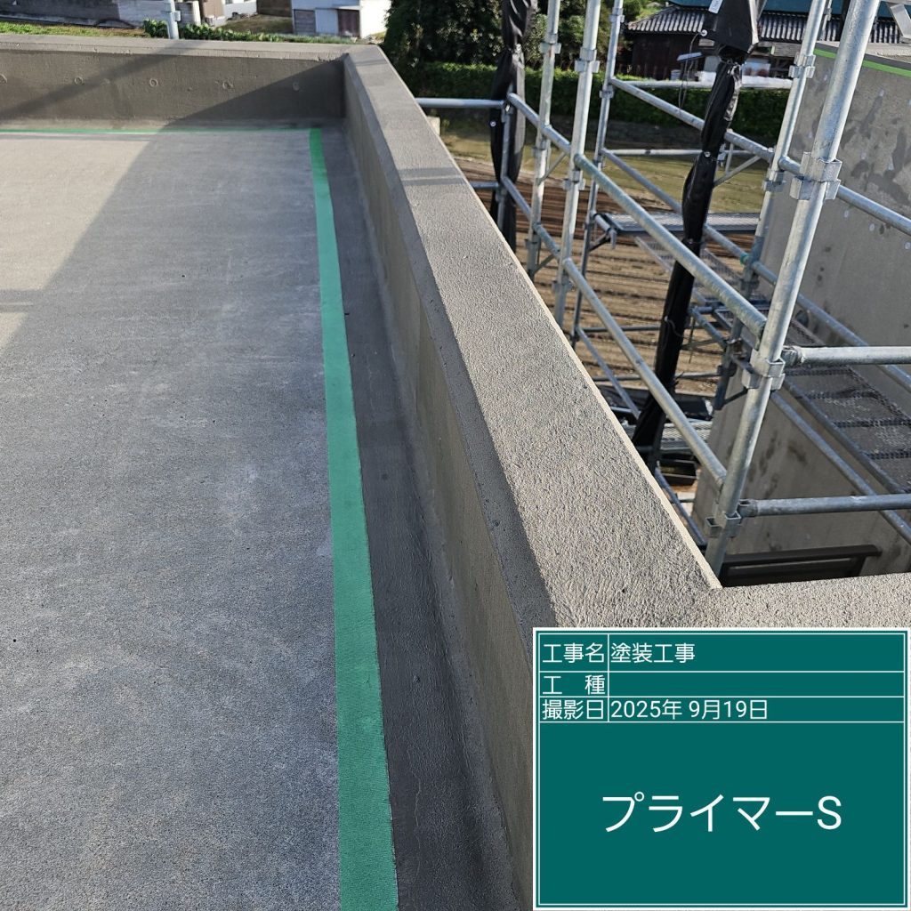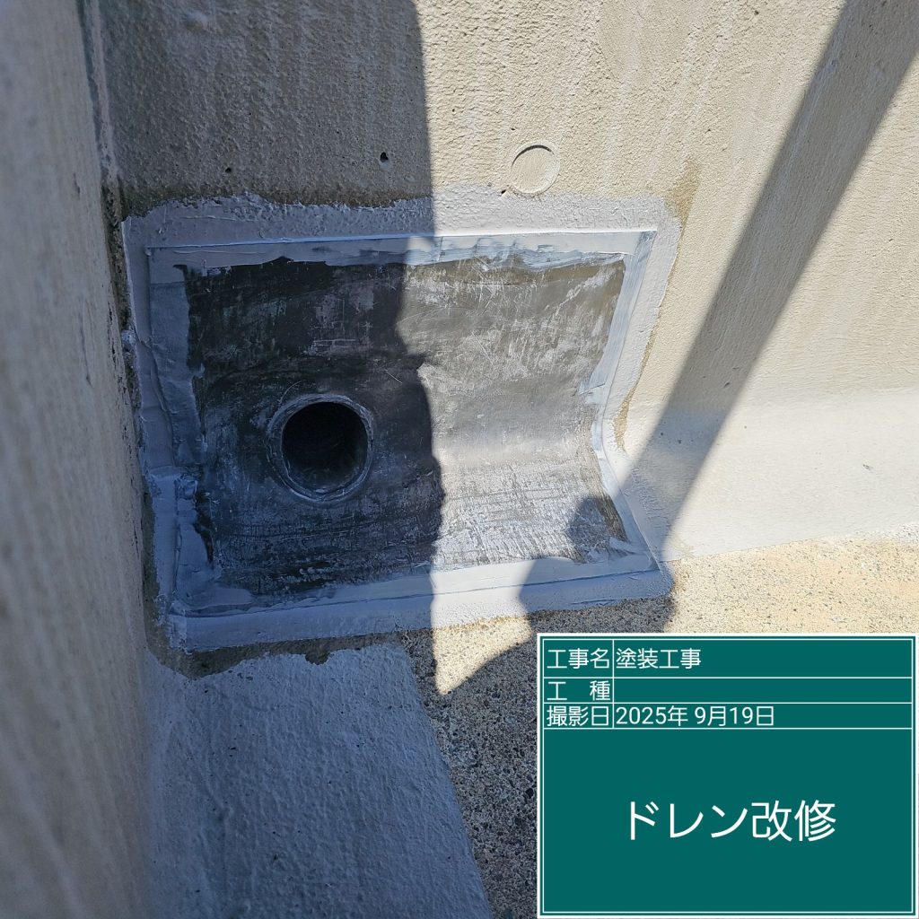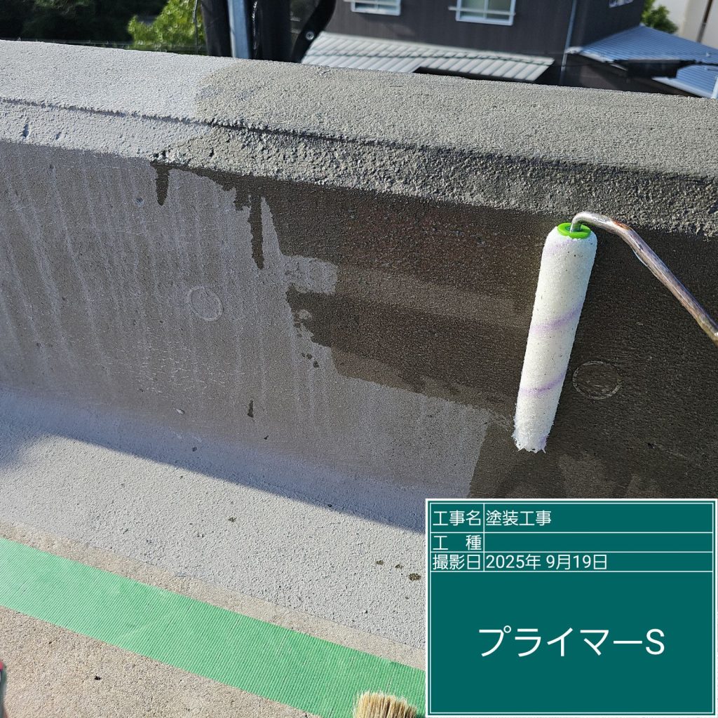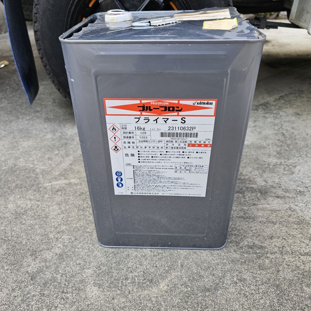 ドレン改修後、防水材の下塗り材として“密着性向上”と下地の“吸い込み防止”をするためにプライマーを塗布します。