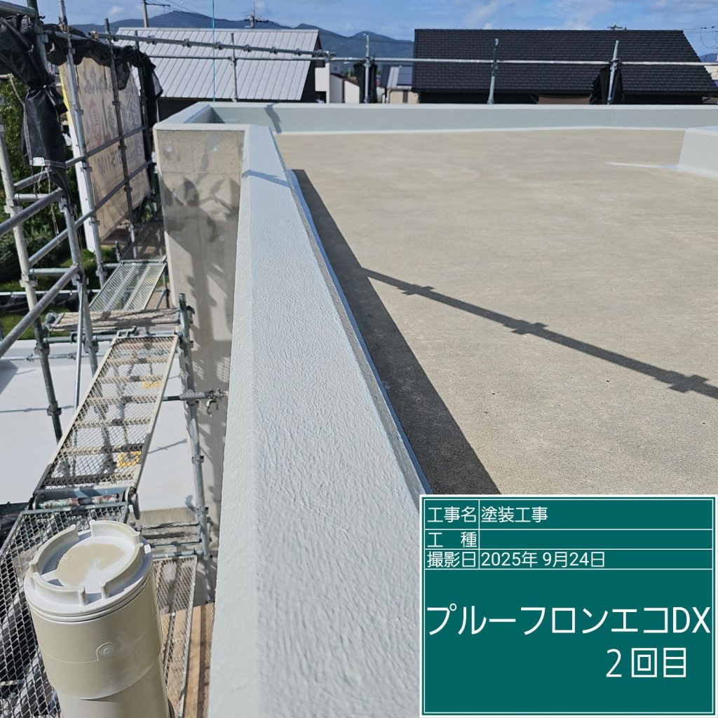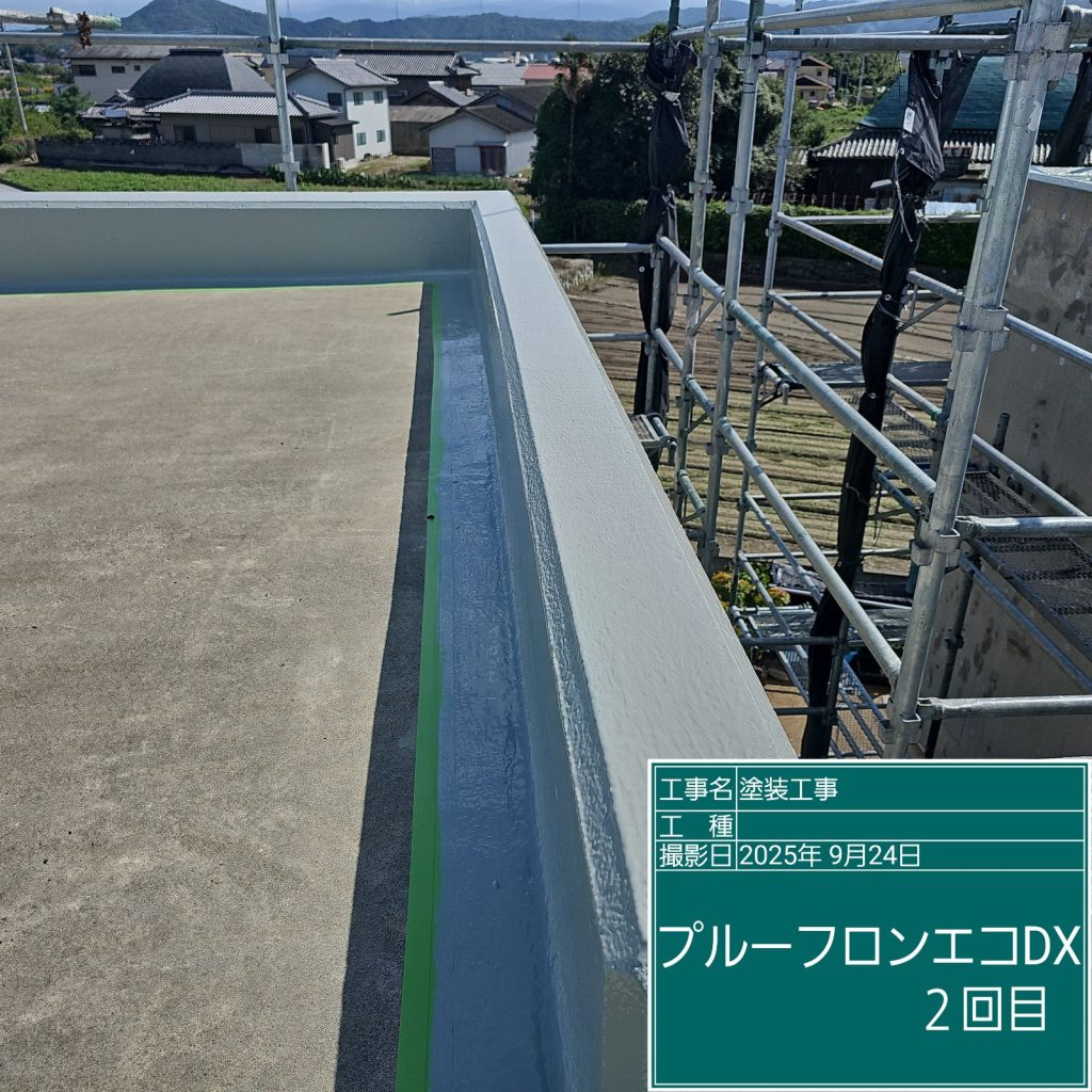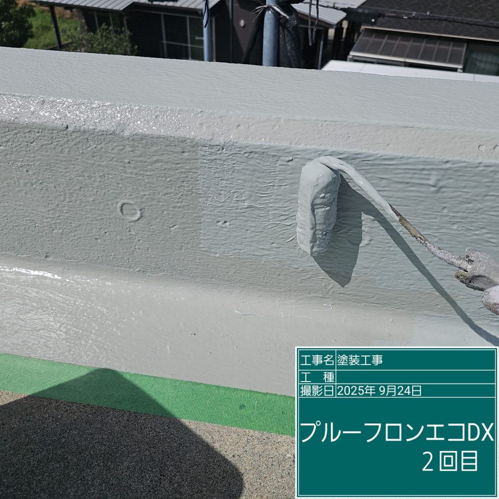 ウレタン塗膜防水はしっかりと厚みを付けないと防水の耐久性に問題がありますので、最低でも2回は塗布しないと意味がありません。