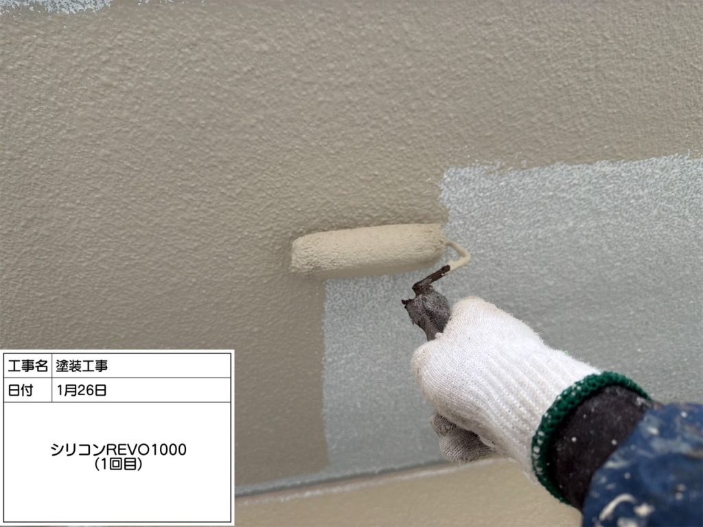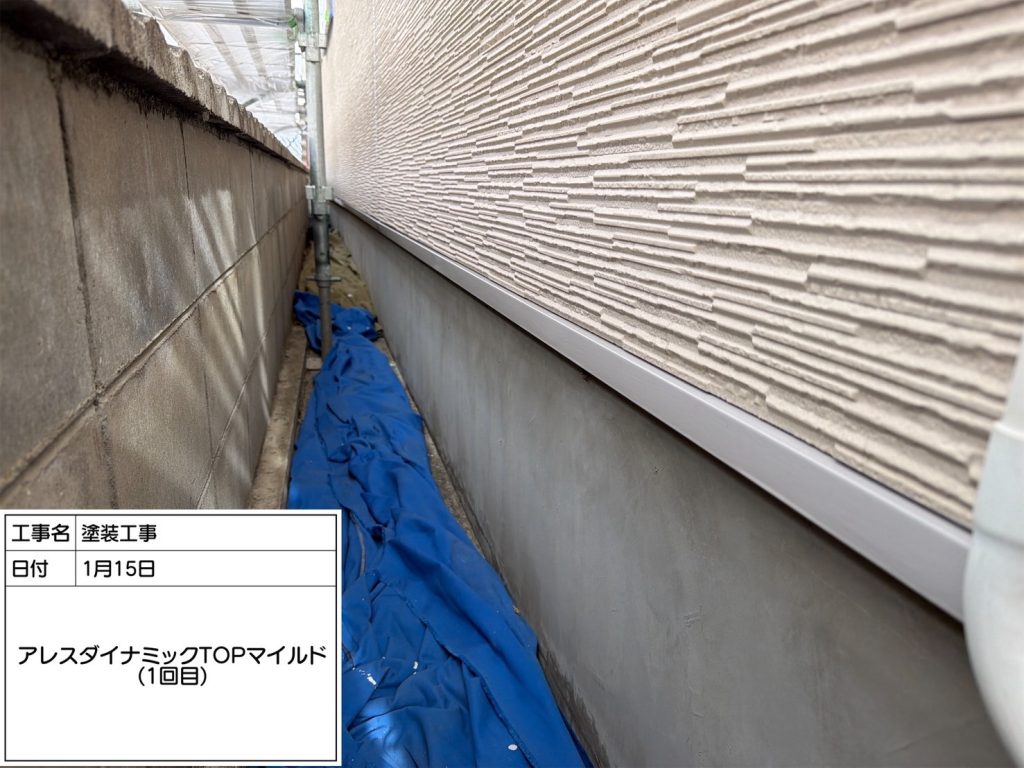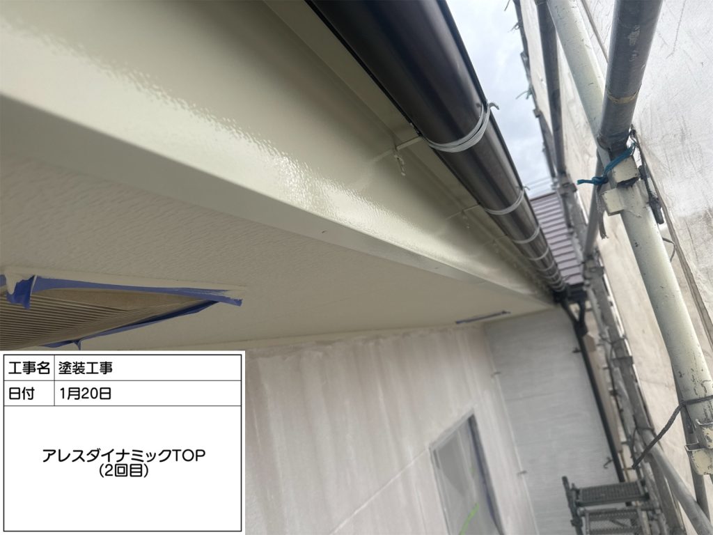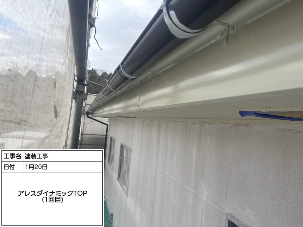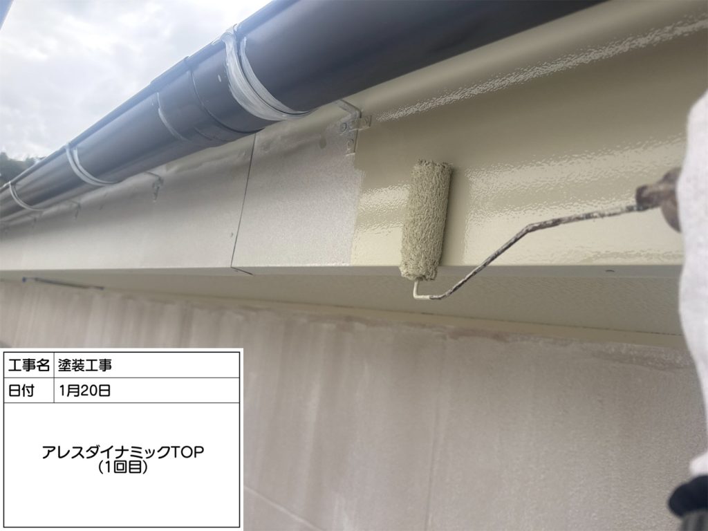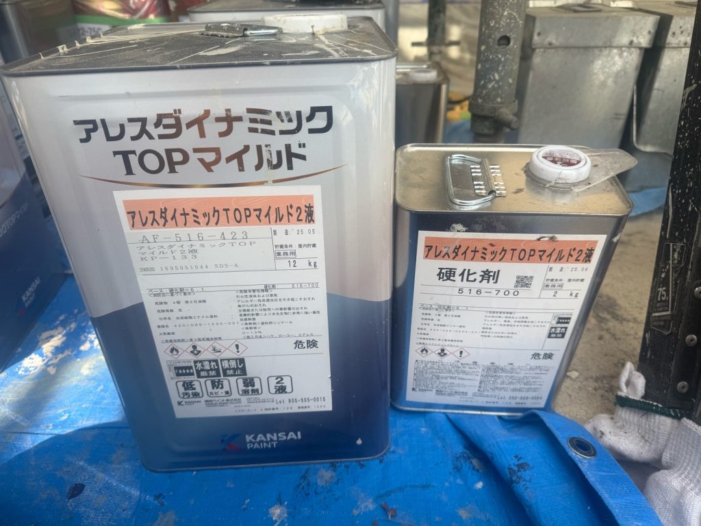 続いて中塗り、上塗りは「アレスダイナミックTOPマイルド2液」。この塗料はフッ素塗料に迫る高耐候性塗料です👆