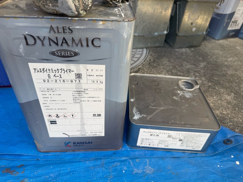 ケレン作業で下地処理を行い塗料の付着性を向上させた後は、下塗り工程です。下塗り使用塗料は関西ペイント「アレスダイナミックプライマー」。
