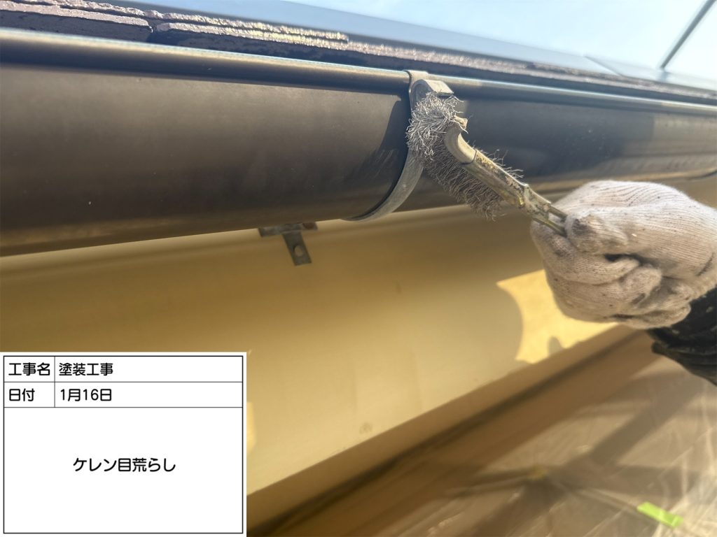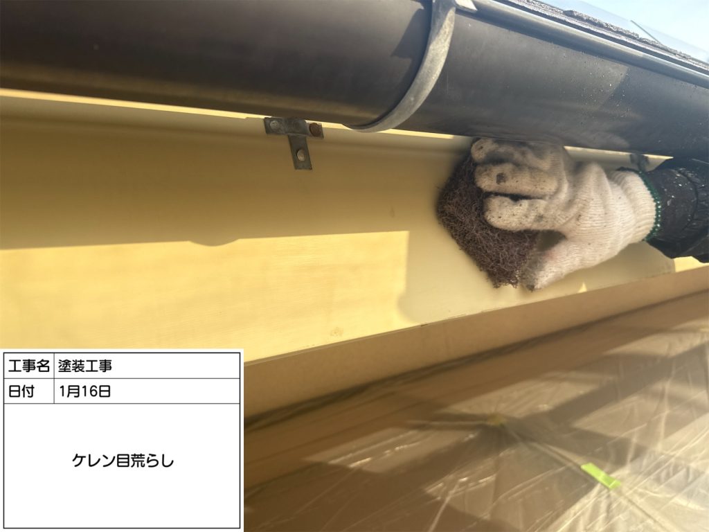 まずは塗装前のケレン作業からスタートです。ケレン作業とは、弱くなった旧塗膜を剝がしたり、表面を研磨して仕上がりを良くするために行います。ケレン作業を行わずにそのまま塗装すると、早期に剥がれてしまったり、仕上がりが悪くなる恐れがありますので、ケレンなどの下地処理はとても重要になります👆