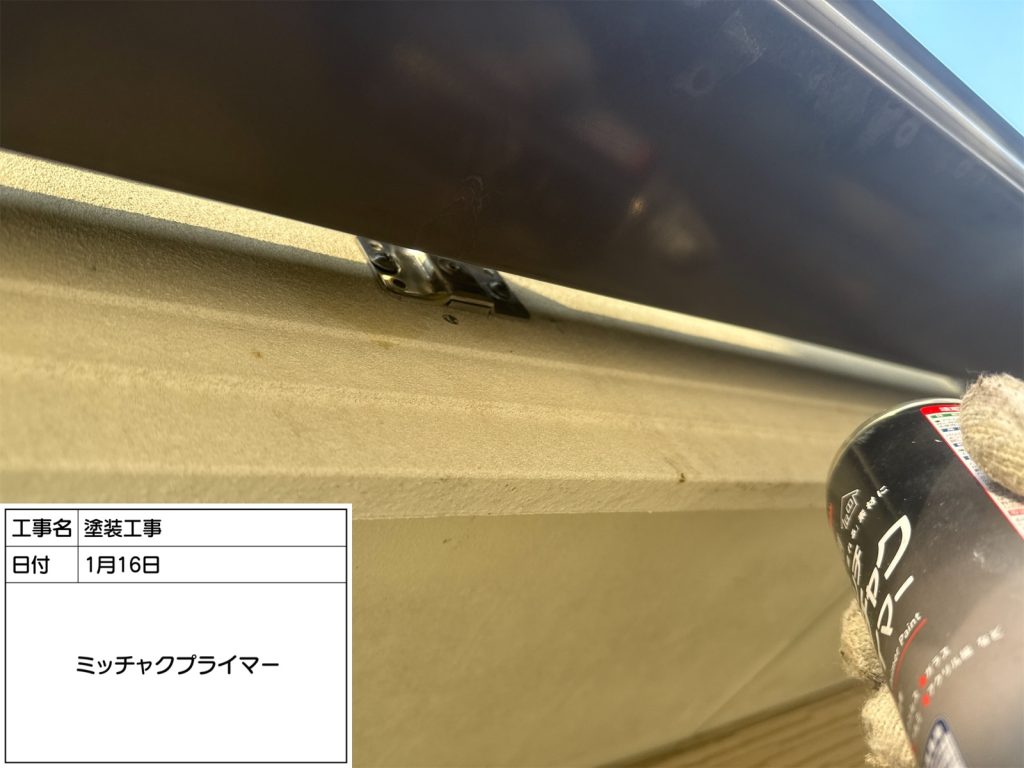 すぐ横に雨樋、吊り金具がありますので、金属部の下地処理も同時に行います。ステンレス製金具部分に密着プライマーを塗布し、密着性を向上させます👆