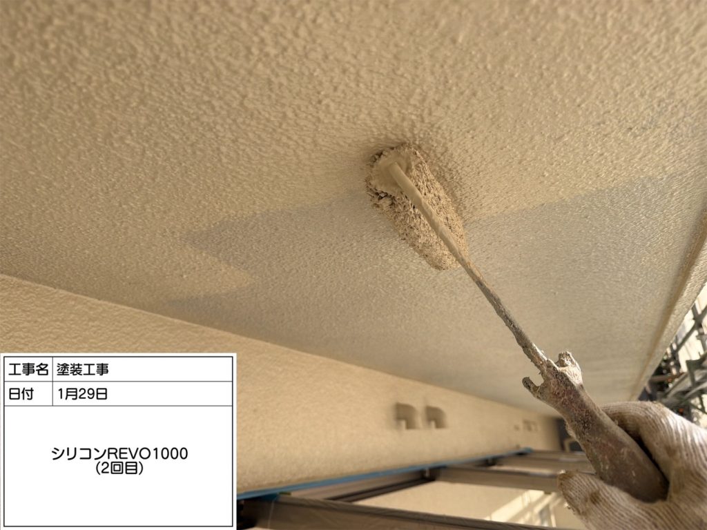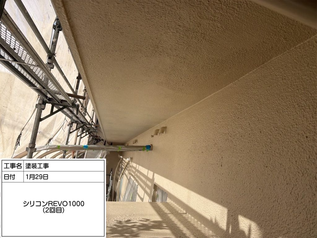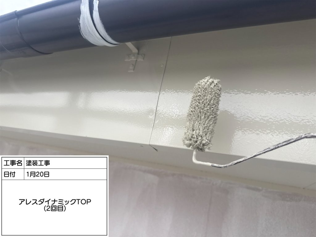 下塗り乾燥後、中塗り上塗り作業です。使用塗料はアステックペイント「アレスダイナミックTOPマイルド」。