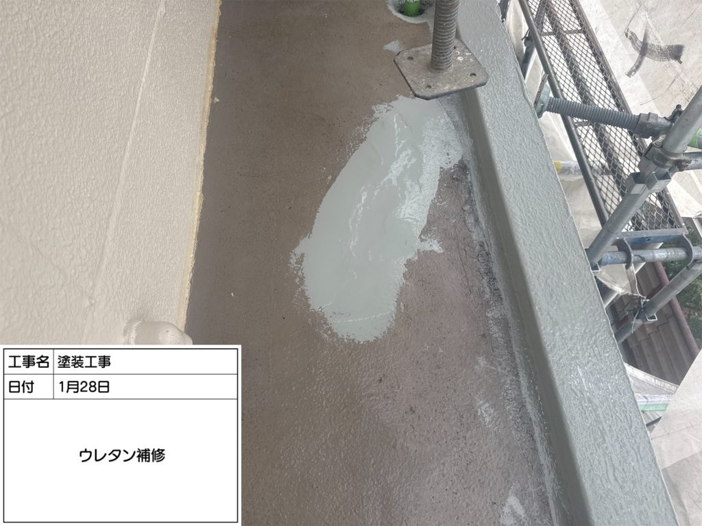 前回の旧塗膜の浮きや、モルタルの浮きが数ヶ所見受けられましたので、全面に防水材を流す前に部分的にウレタン防水材を金コテで塗布し、下地を平滑に整えます。