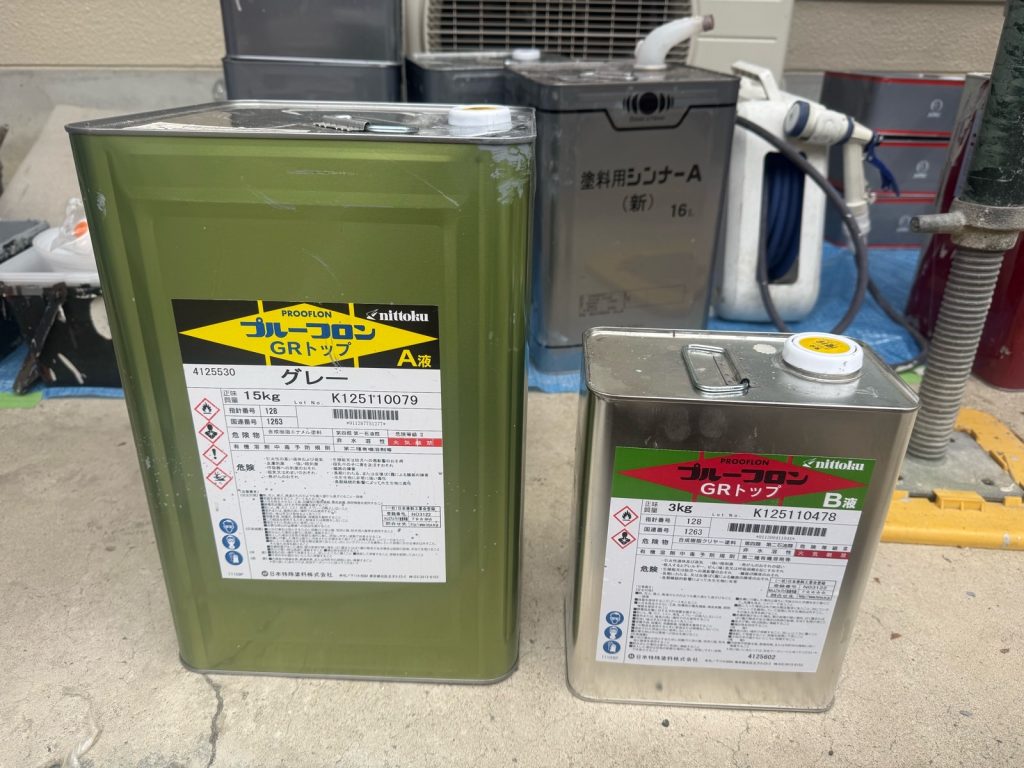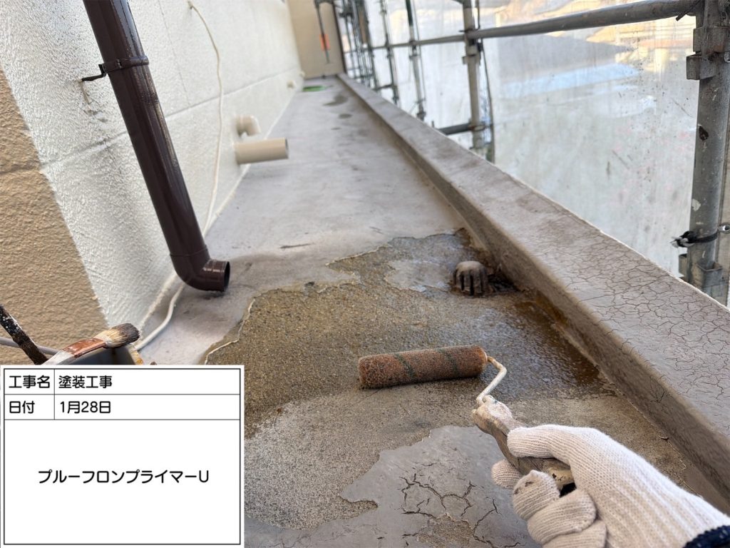まずは、ウレタン塗膜防水の下塗り材として“密着性向上”と下地の“吸い込みを防止”するために“プライマー”を塗布します。