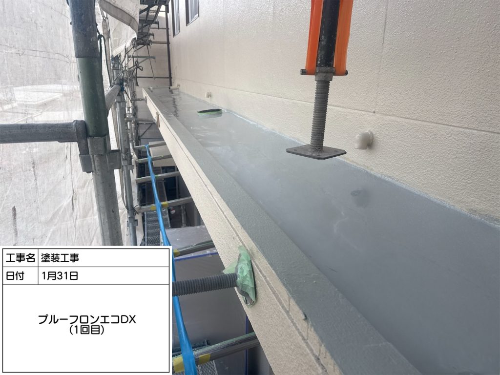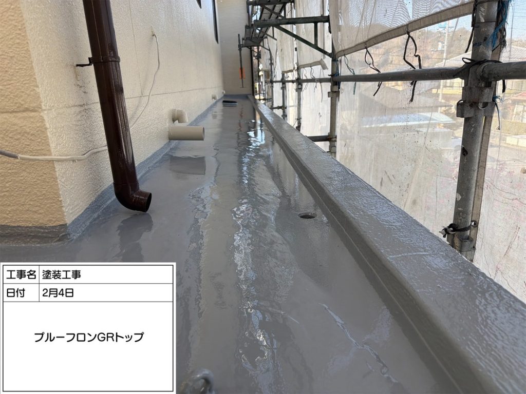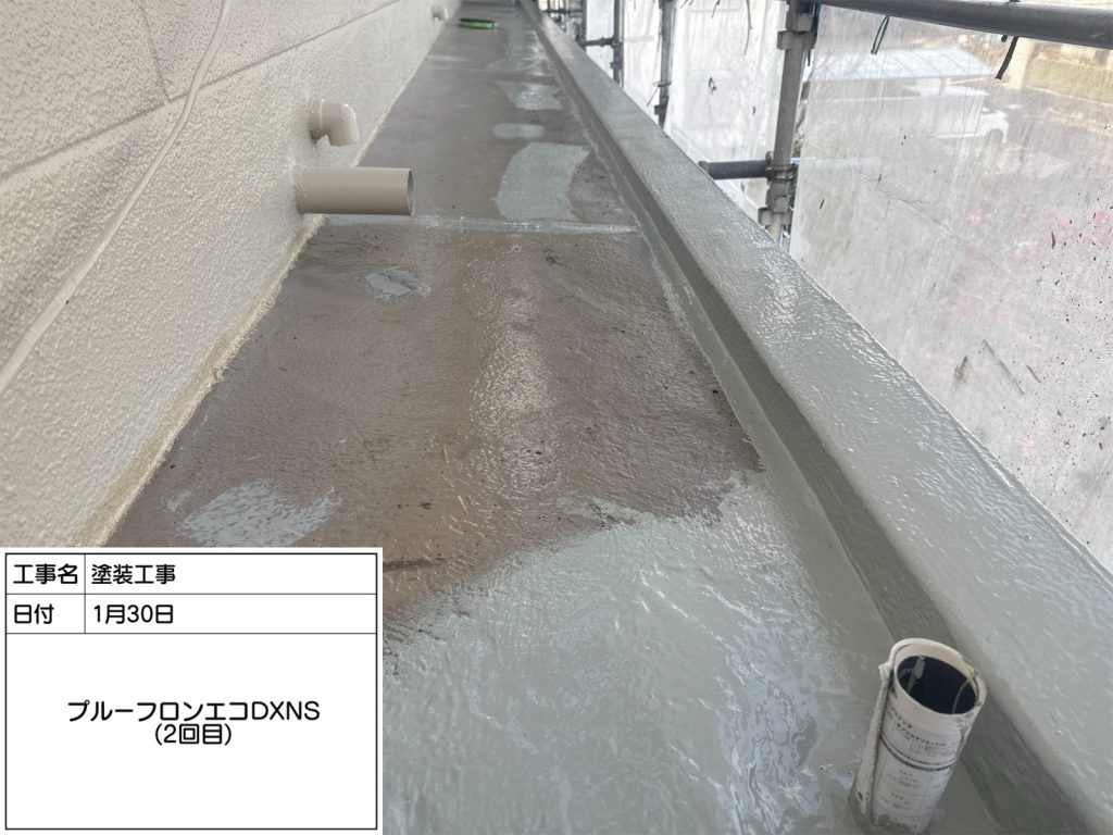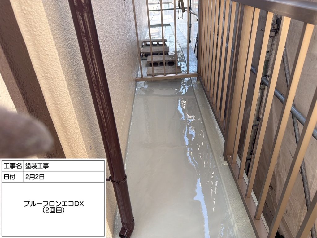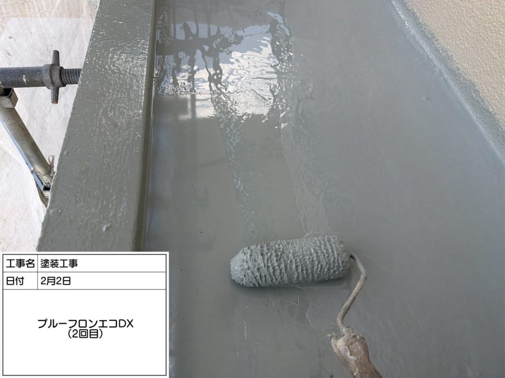 ウレタン塗膜防水2回目の作業です。ウレタン塗膜防水はしっかりと厚みを付けないと防水の耐久性に問題がでますので、最低でも2回は塗布しないと意味がありません。
