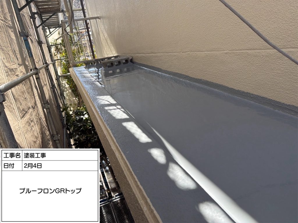 「ウレタン塗膜防水」硬化後、紫外線や雨水から防水層を保護するトップコートを塗装して仕上げます。
