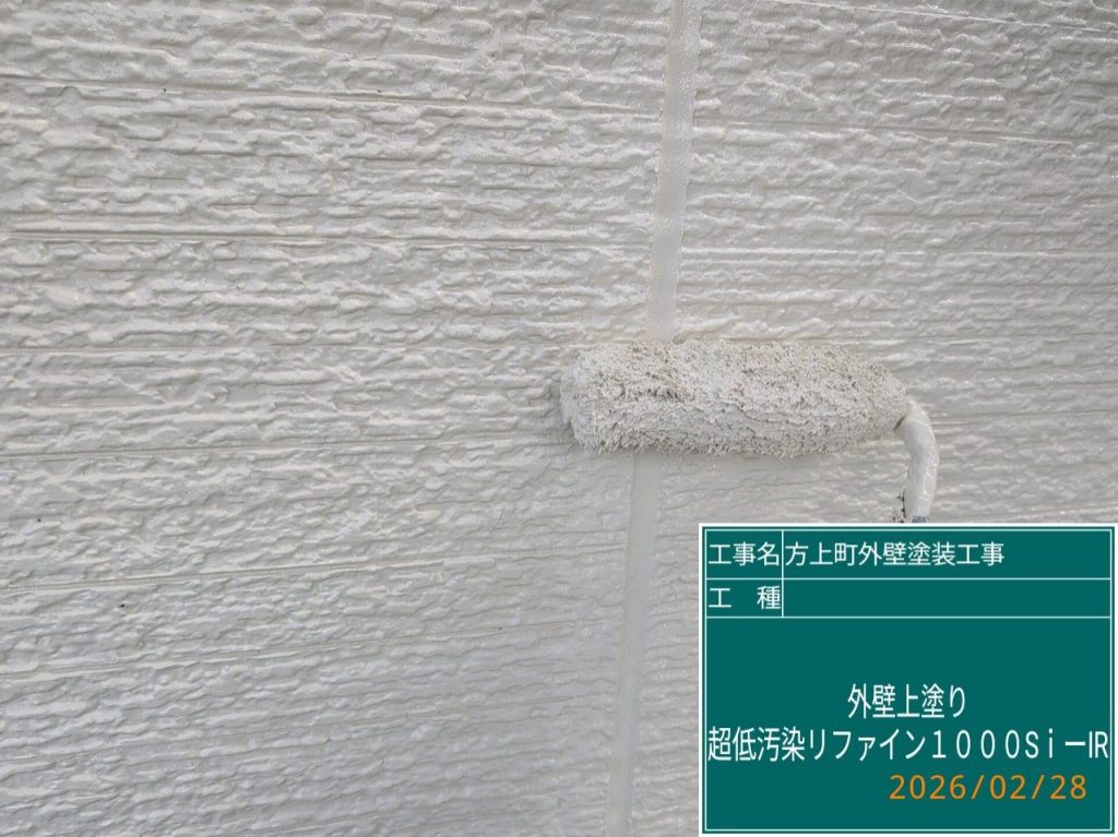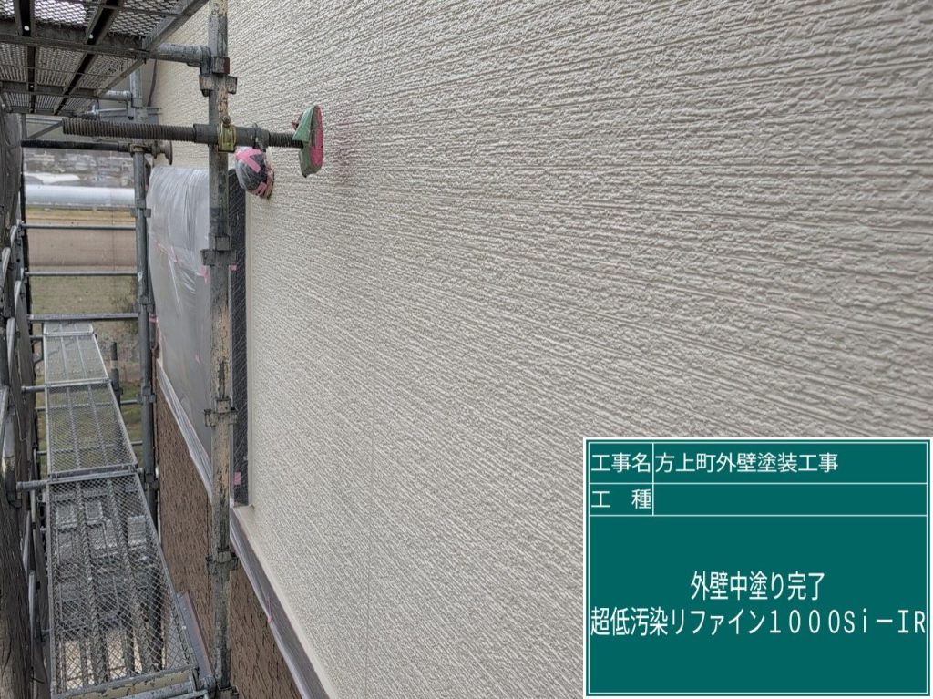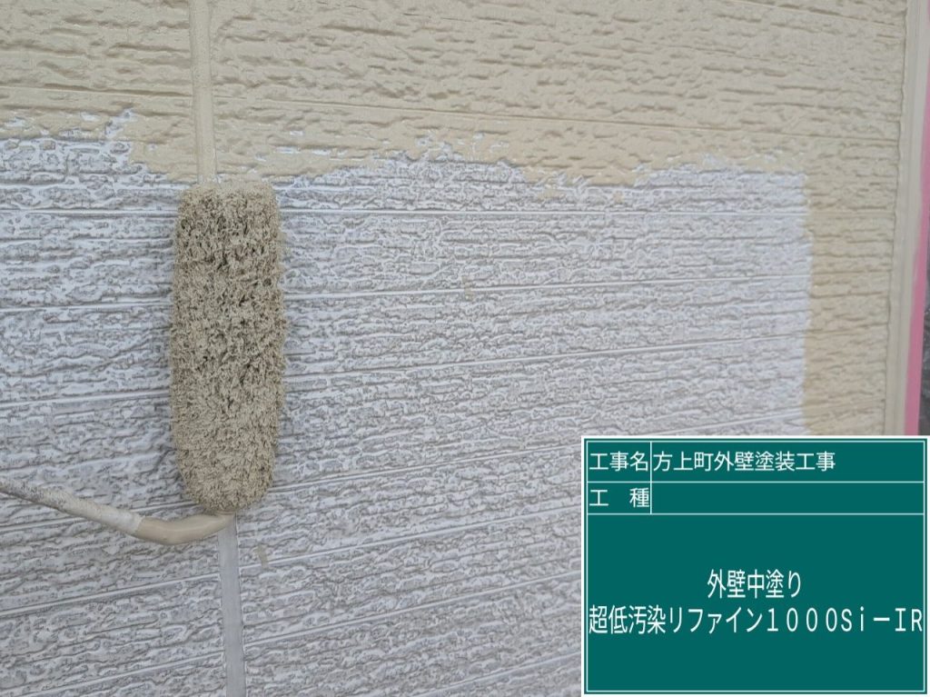 下塗り乾燥後、外壁中塗り作業へと進んでいきます。使用塗料はアステックペイント「超低汚染リファイン1000Si-IR」。