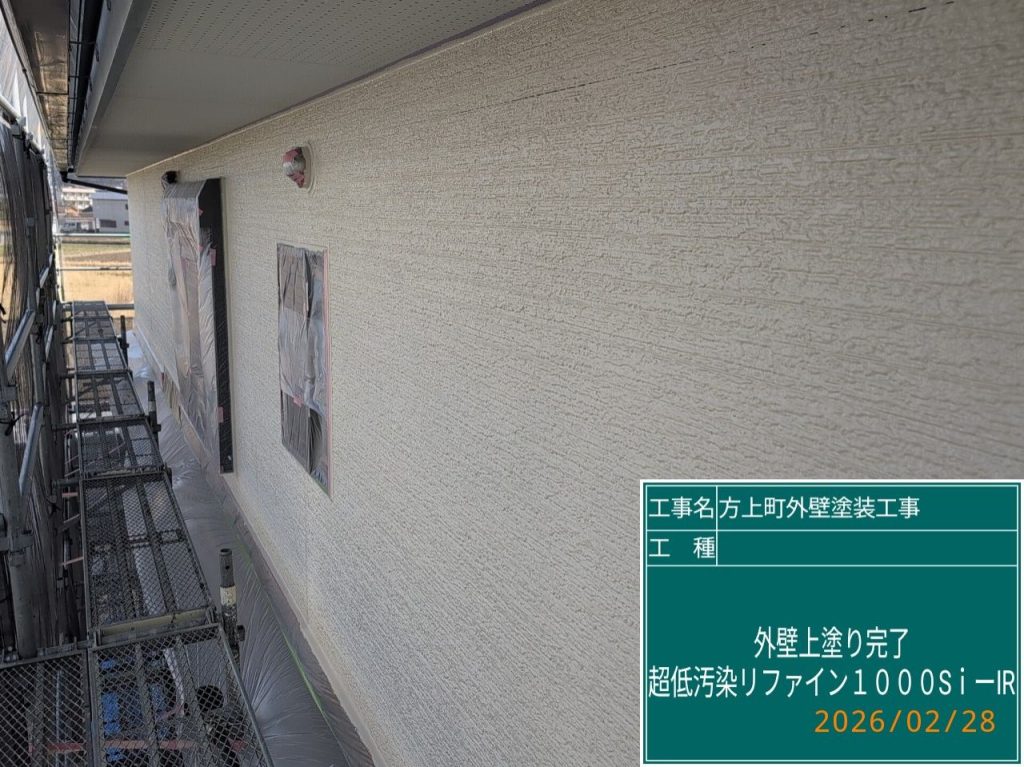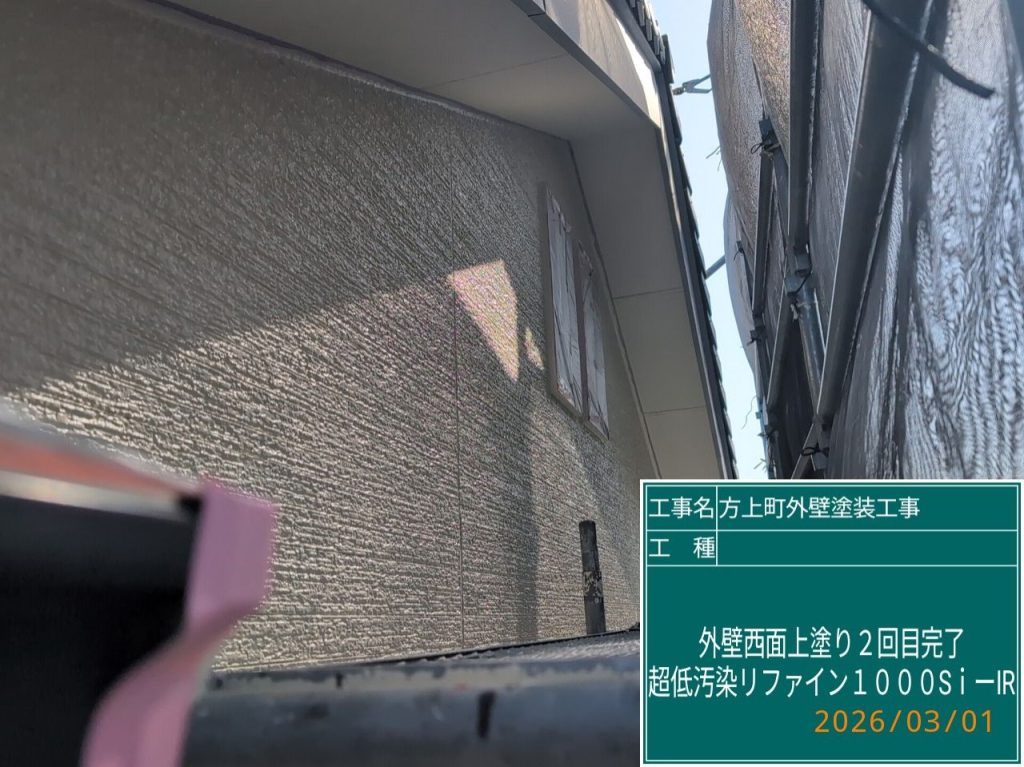 下塗り⇒中塗り⇒上塗りと計3回塗りをして仕様通り進めさせていただきましたが、外壁塗料も少し余りましたので直射日光の影響を大きく受ける【西面】は上塗り2回目(計4回目)の塗装を行いました👆