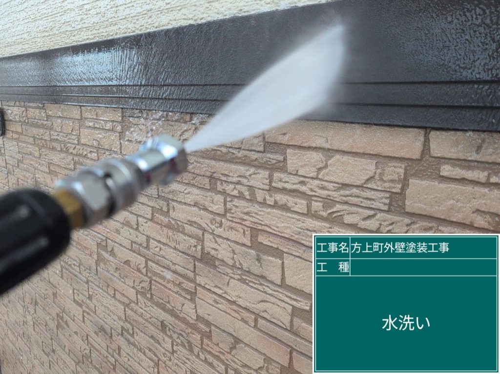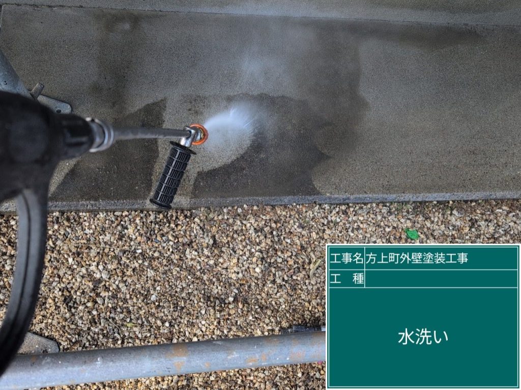 塗装工事に入る前にまずは高圧洗浄機を使って苔や藻などの汚れ、劣化した塗膜を丁寧に落としていきます。