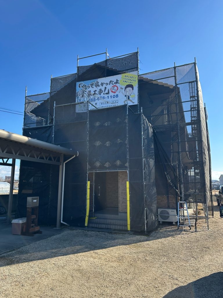 徳島市方上町T様邸の外壁塗装工事が始まりました。しばらくの間、近隣の皆様方には大変ご迷惑をお掛けしますが、ご理解・ご協力をお願い申し上げますm(__)m